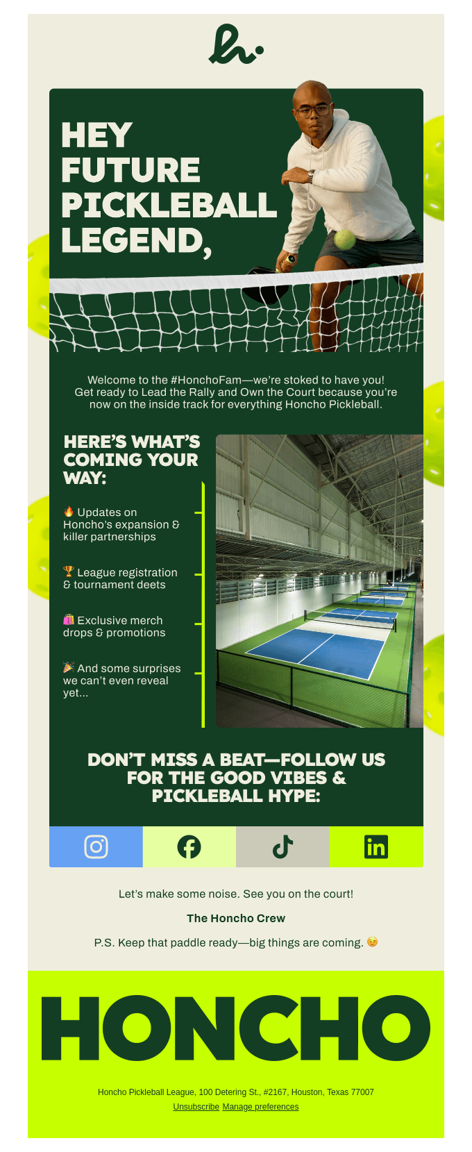 Original Subject Line: "Welcome to the #HonchoFam! 🎉🏓"
